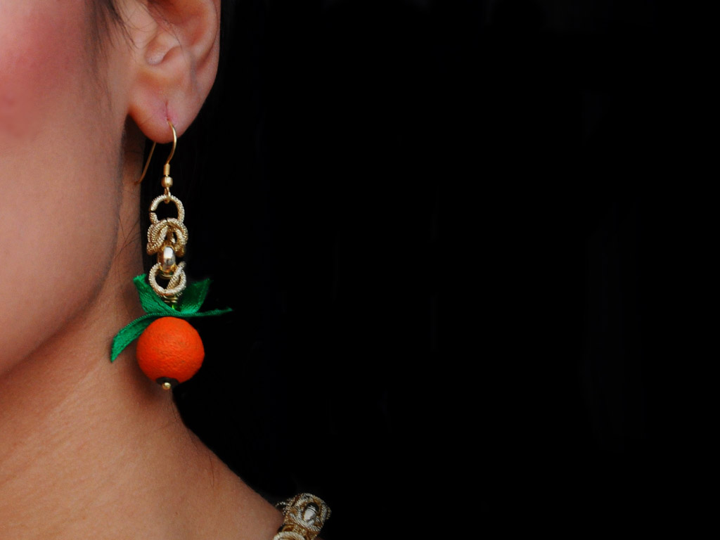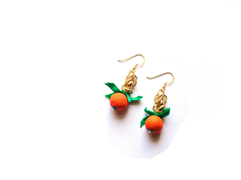 Orecchini pendenti charms , con catena in alluminio lavorato con trattamento pvd gold, inserti “arance” in ceramica e nastrino verde