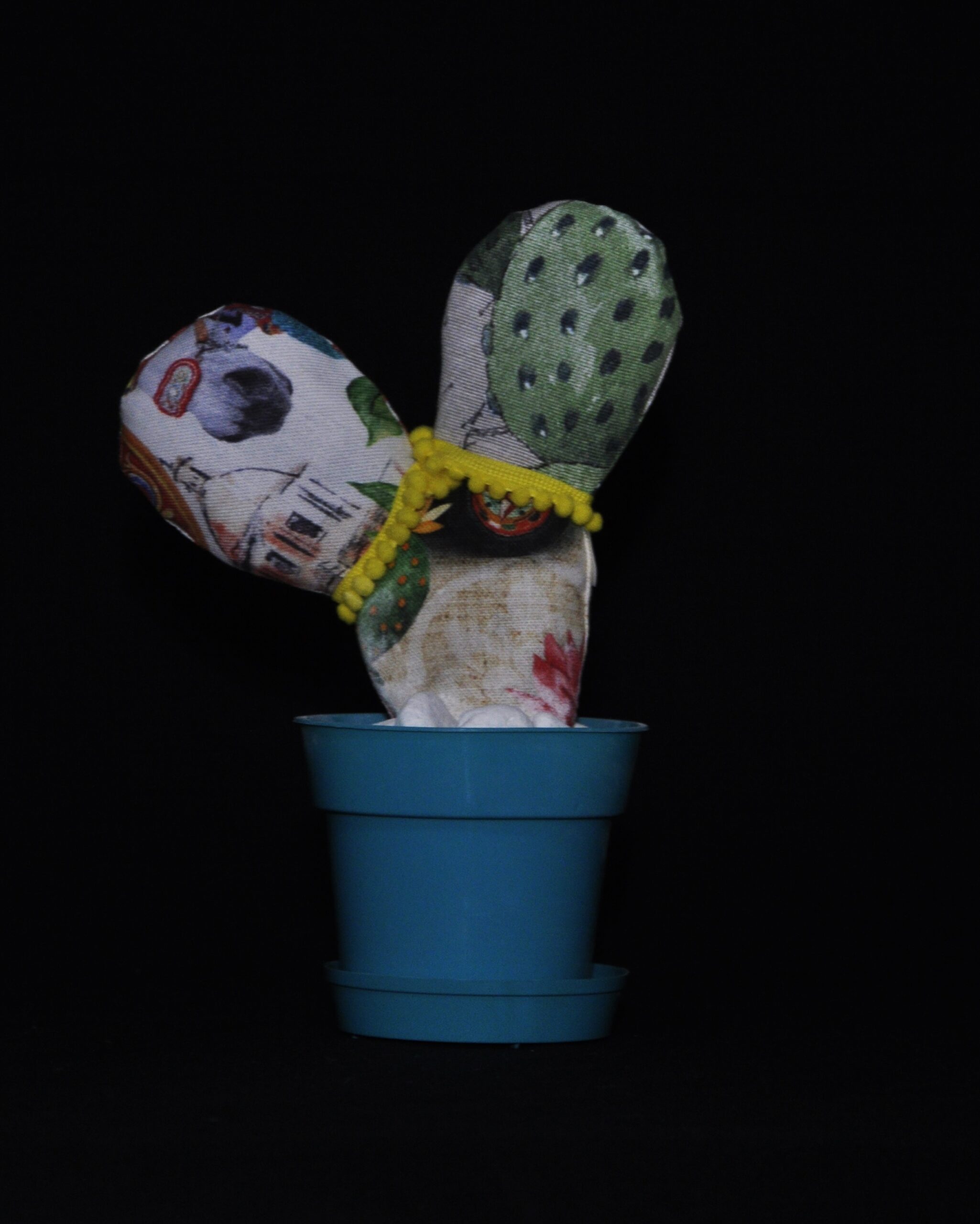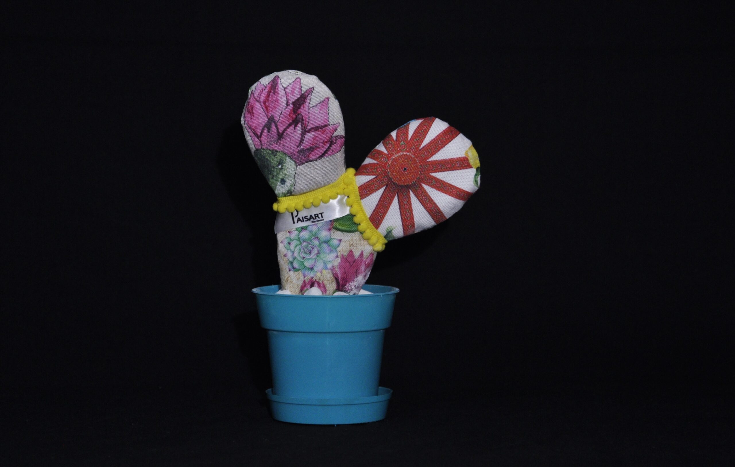 Pala in tessuto stampato a fantasia come da foto ornata con frangia e pon pon gialla .