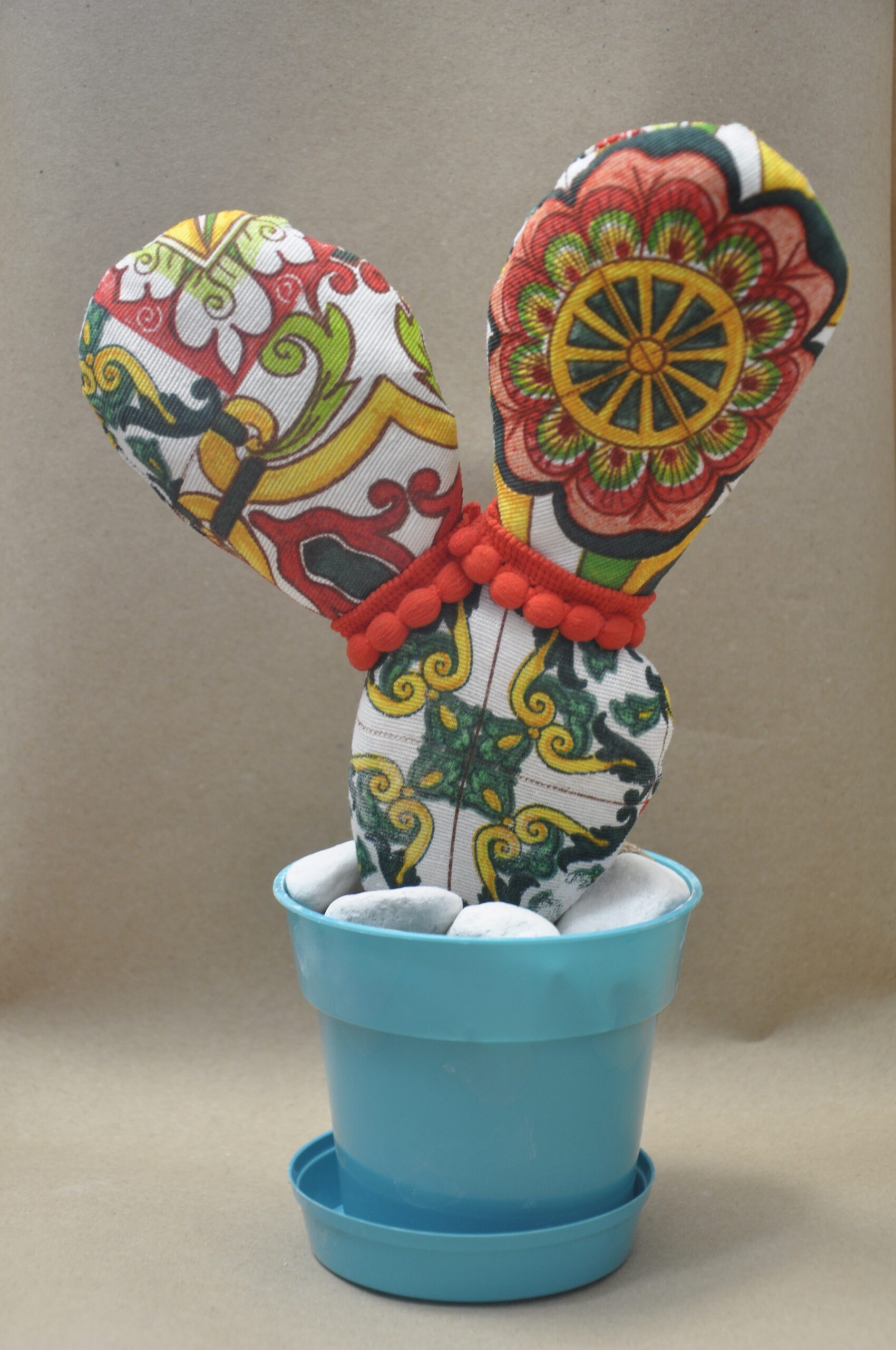Pala in tessuto stampato a fantasia come da foto ornata con frangia rosa.